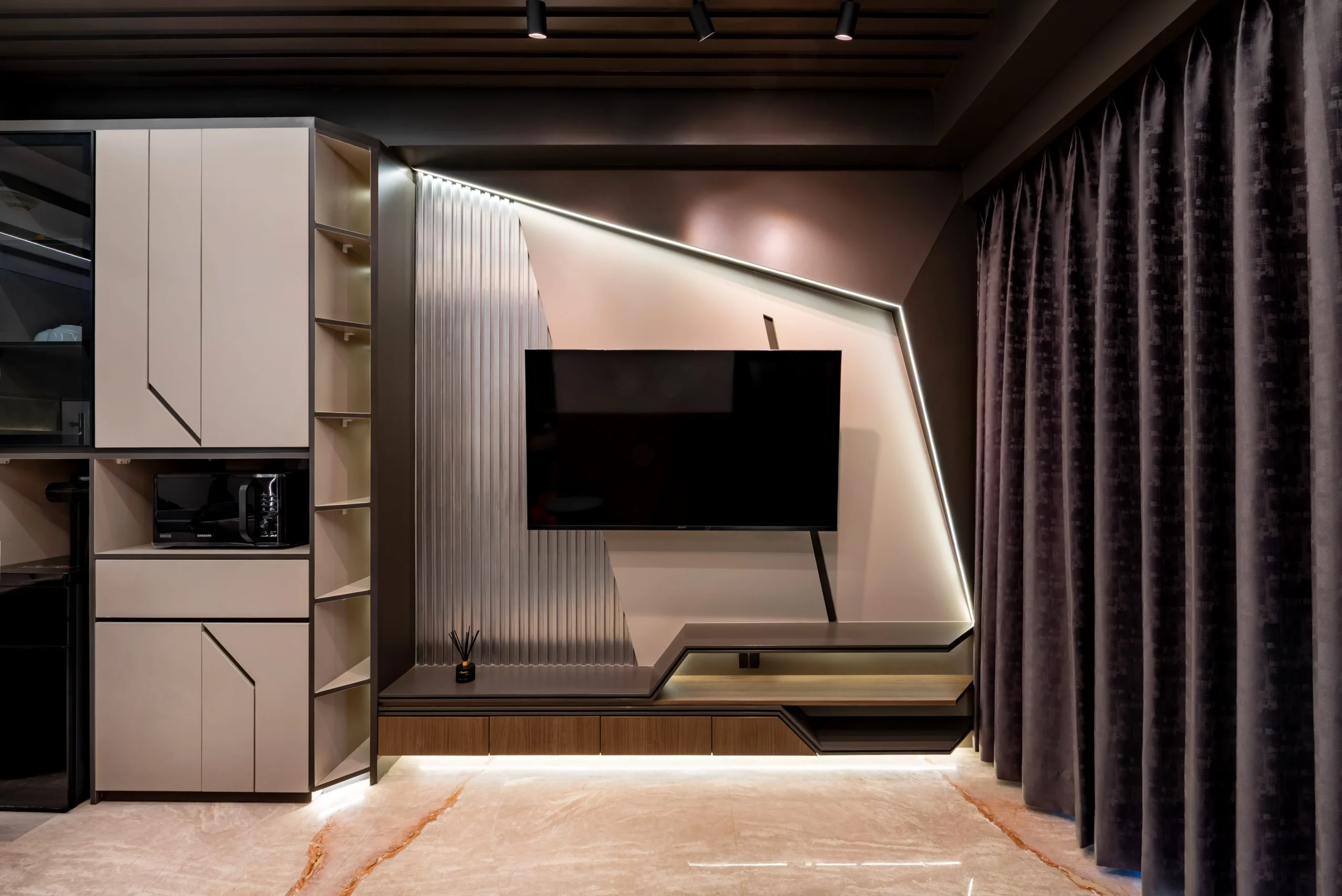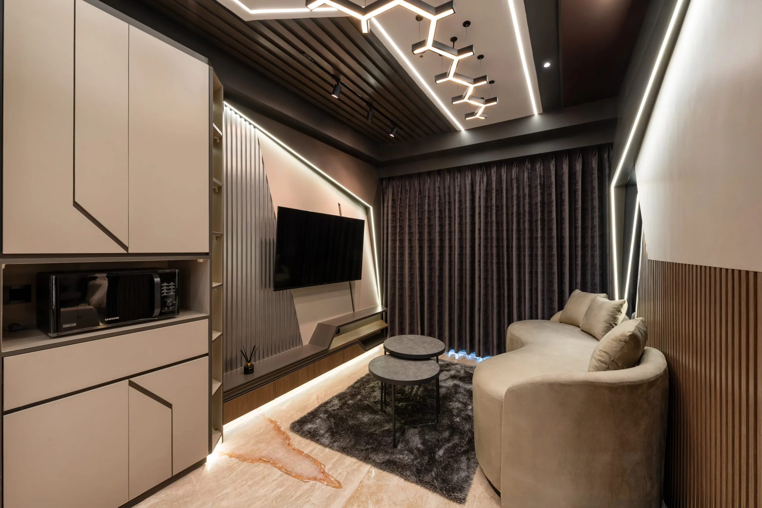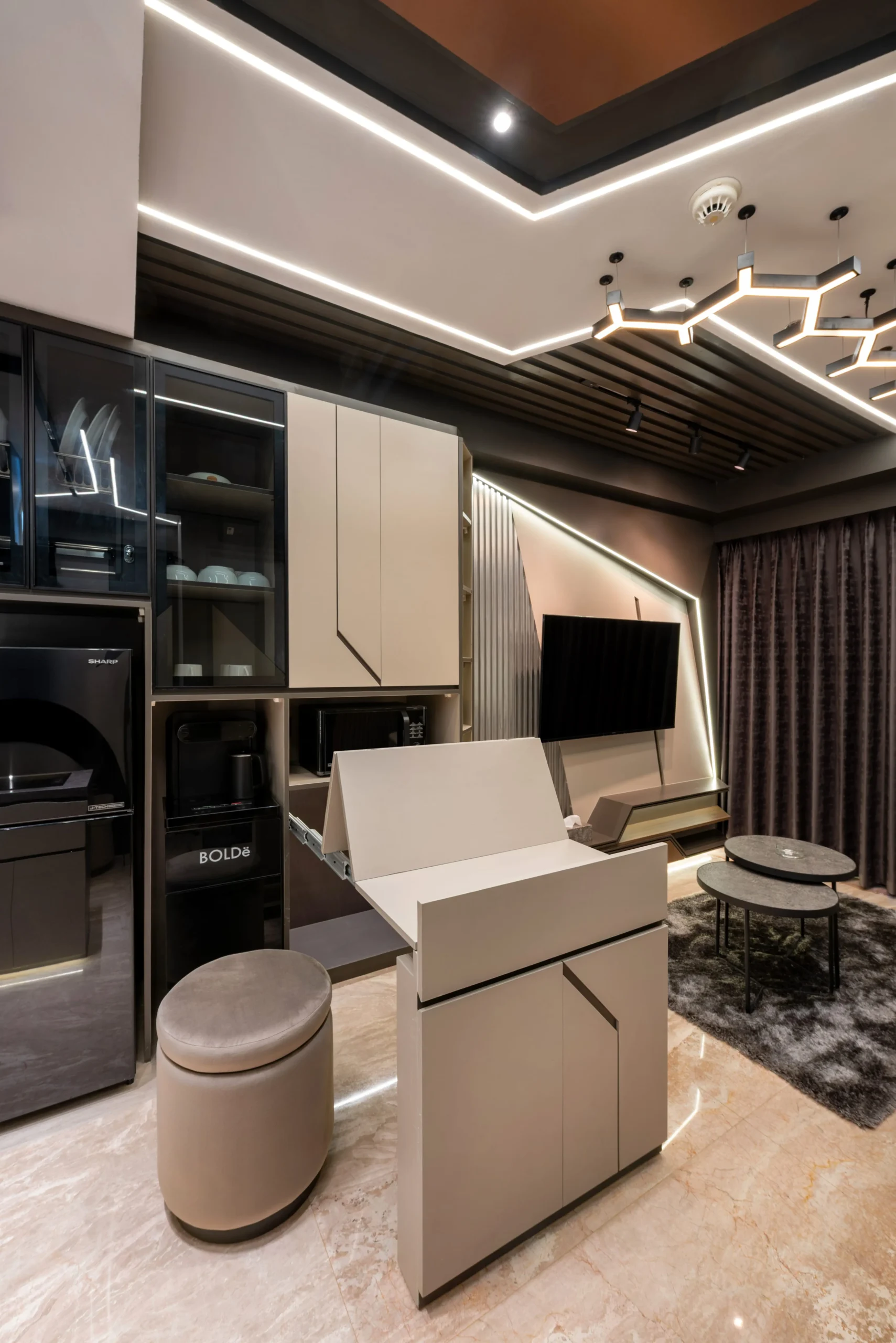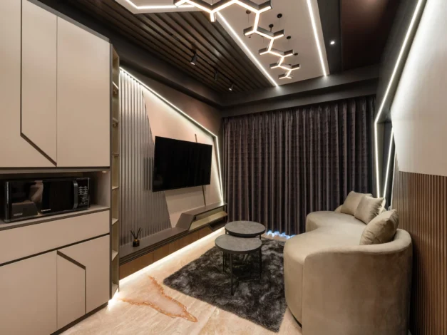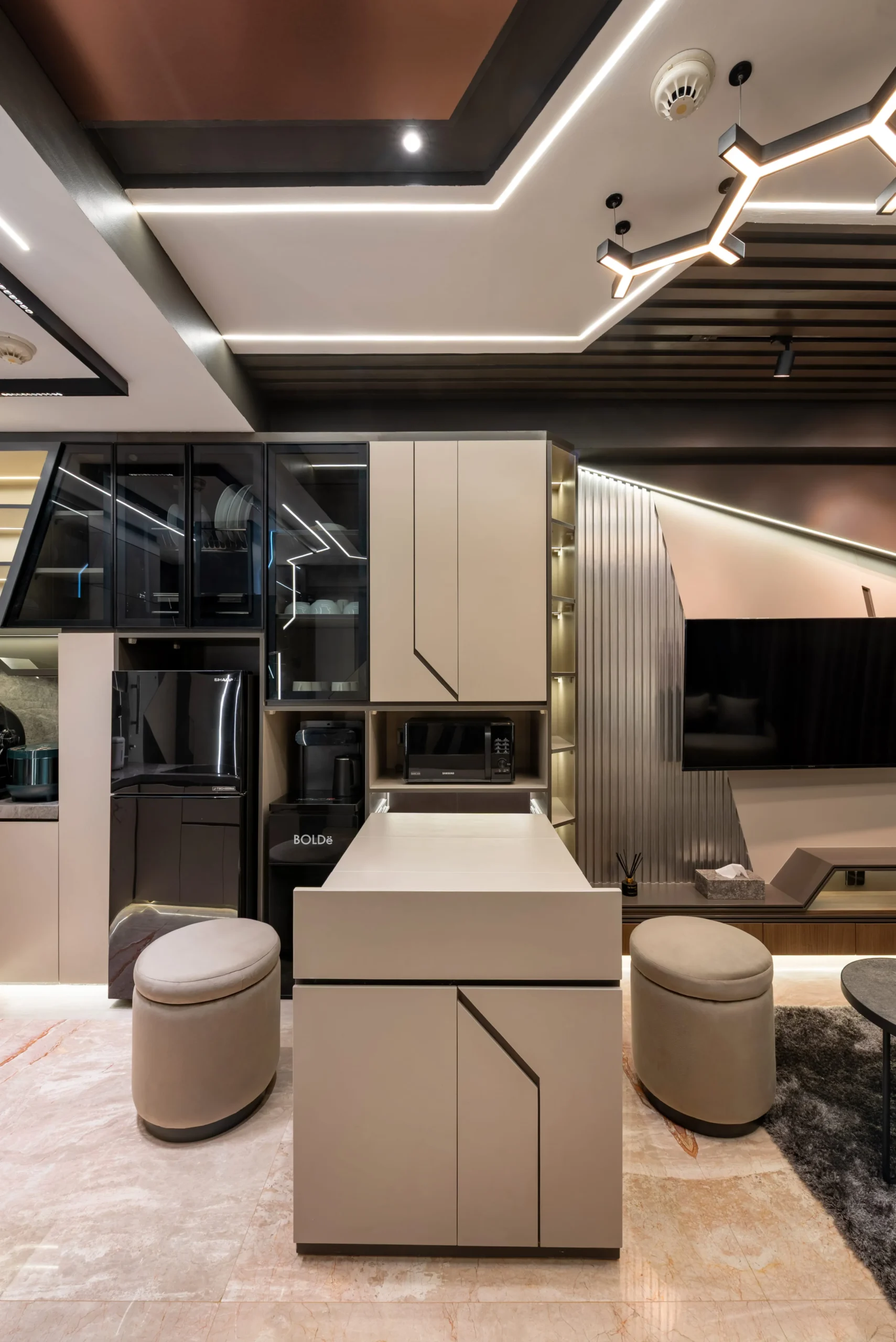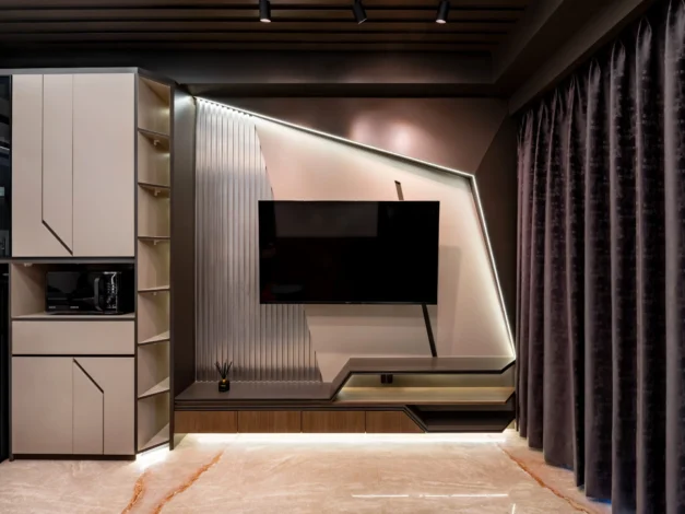 Tantangan utama pada proyek ini adalah bagaimana mengeksekusi bentuk-bentuk geometris yang rumit serta mengakomodasi kerumitan instalasi smart-technology tersembunyi, tanpa mengorbankan estetika dan proporsi ruang yang telah dirancang.