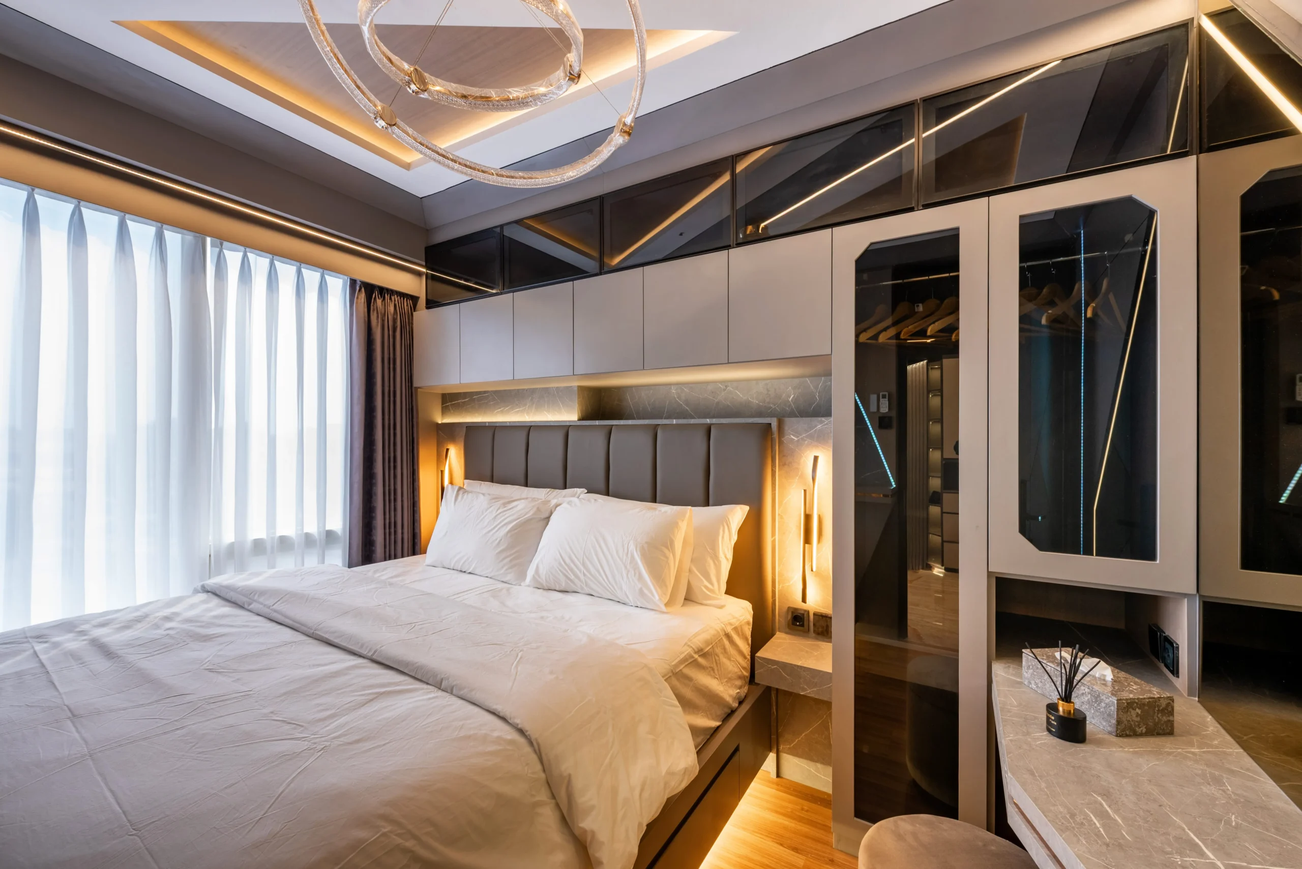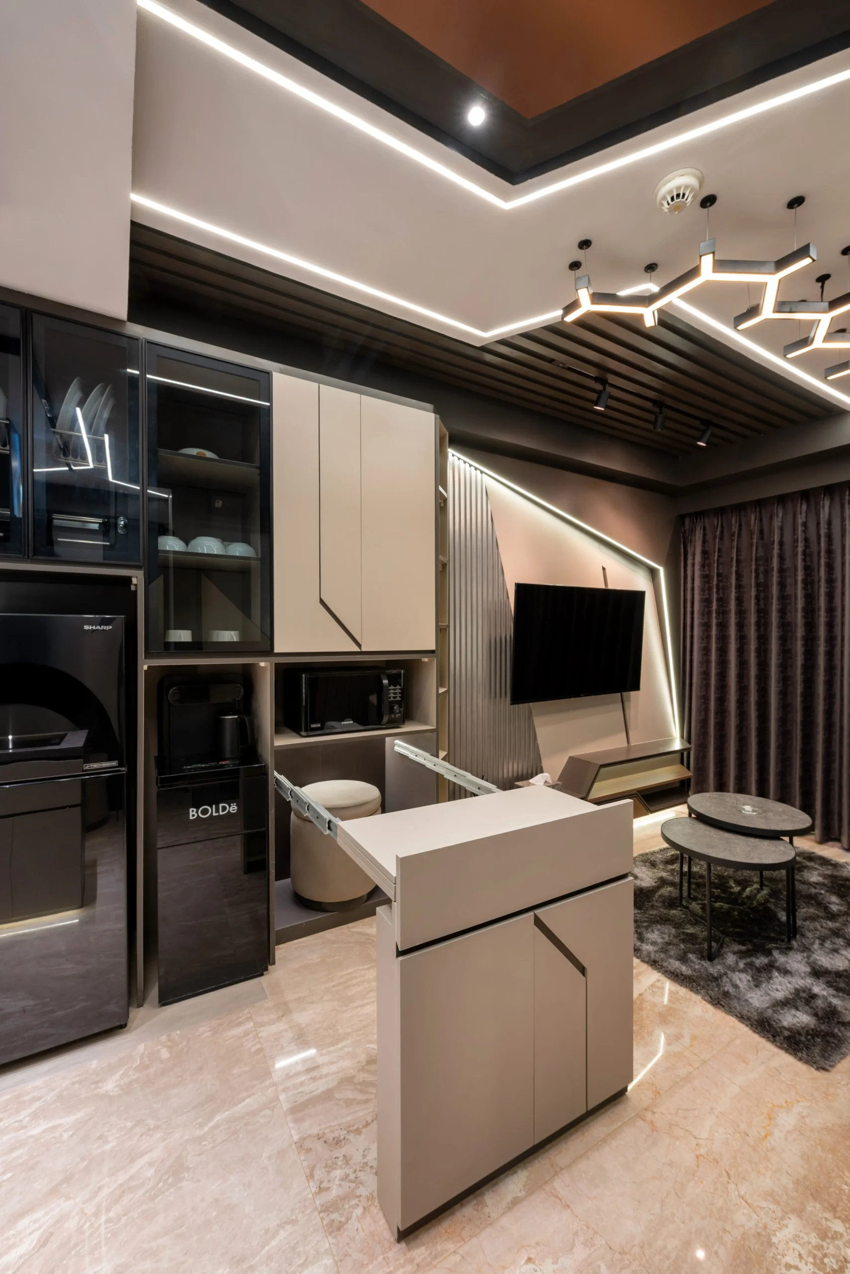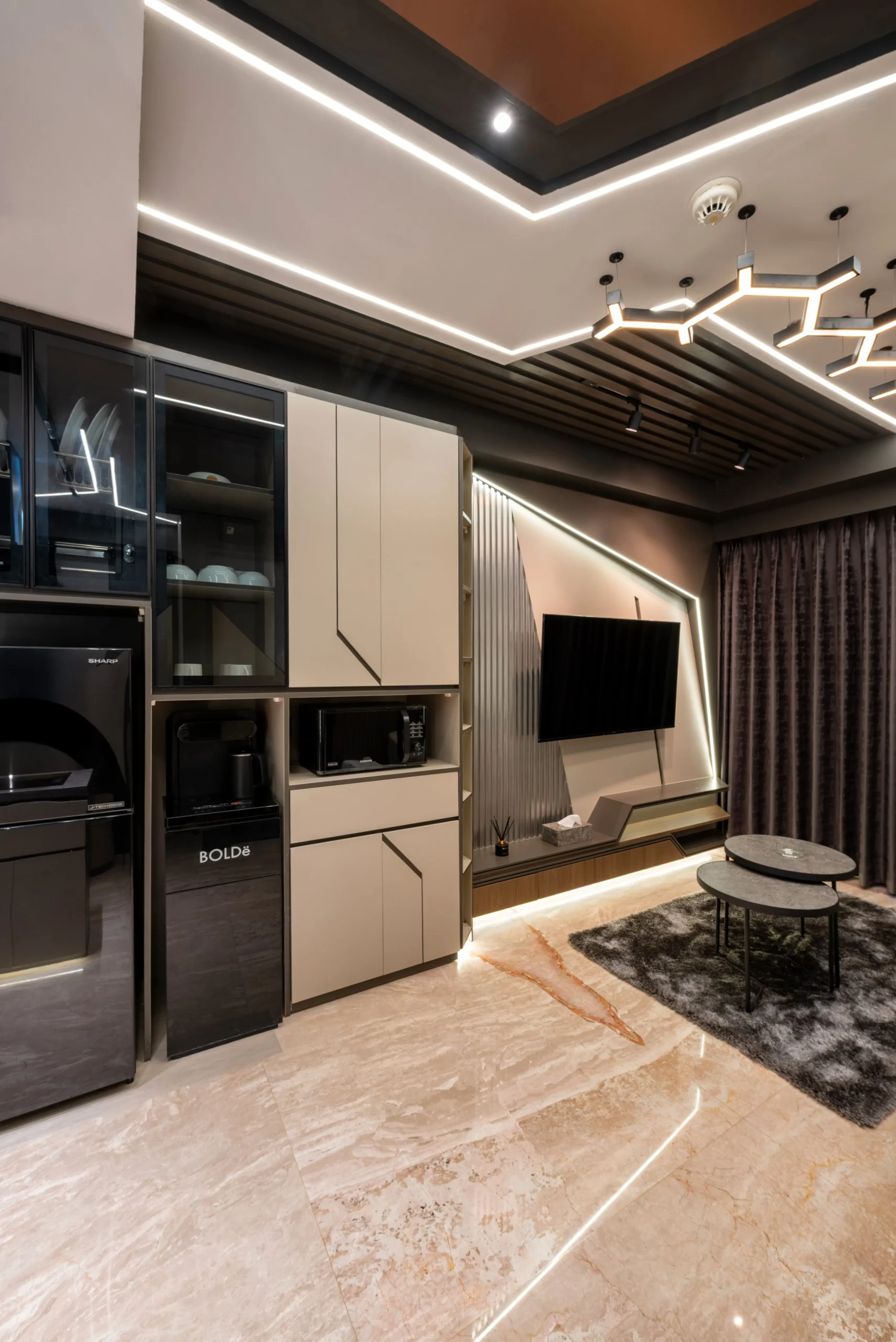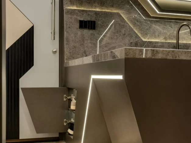 Tantangan utama pada proyek ini adalah bagaimana mengeksekusi bentuk-bentuk geometris yang rumit serta mengakomodasi kerumitan instalasi smart-technology tersembunyi, tanpa mengorbankan estetika dan proporsi ruang yang telah dirancang.