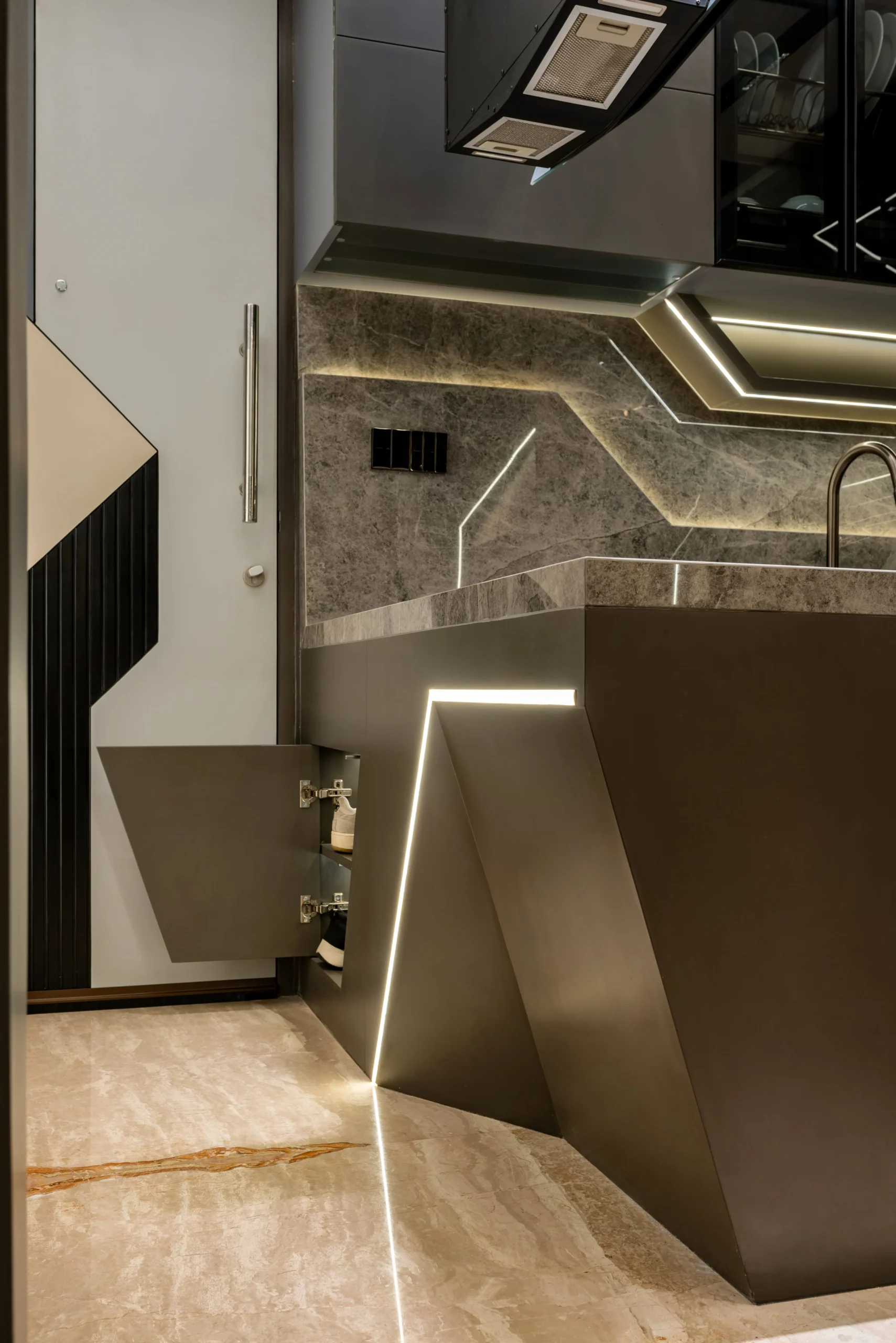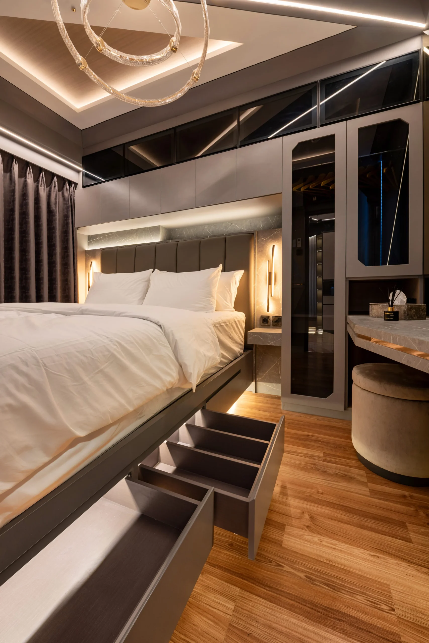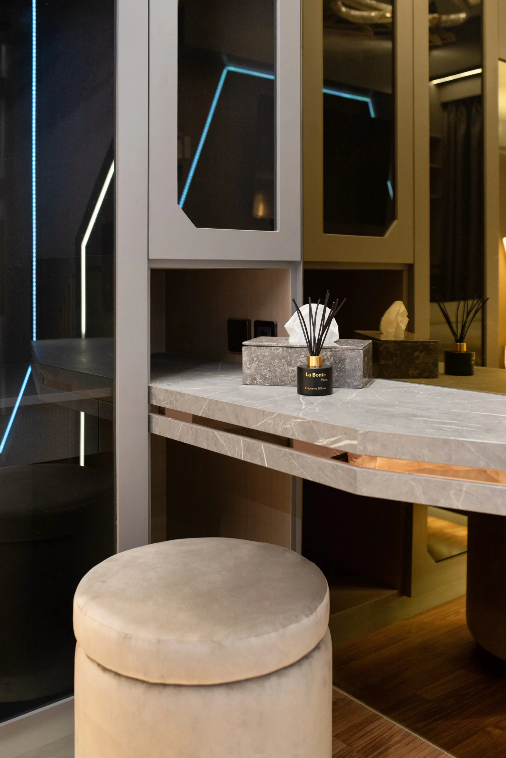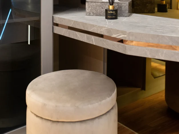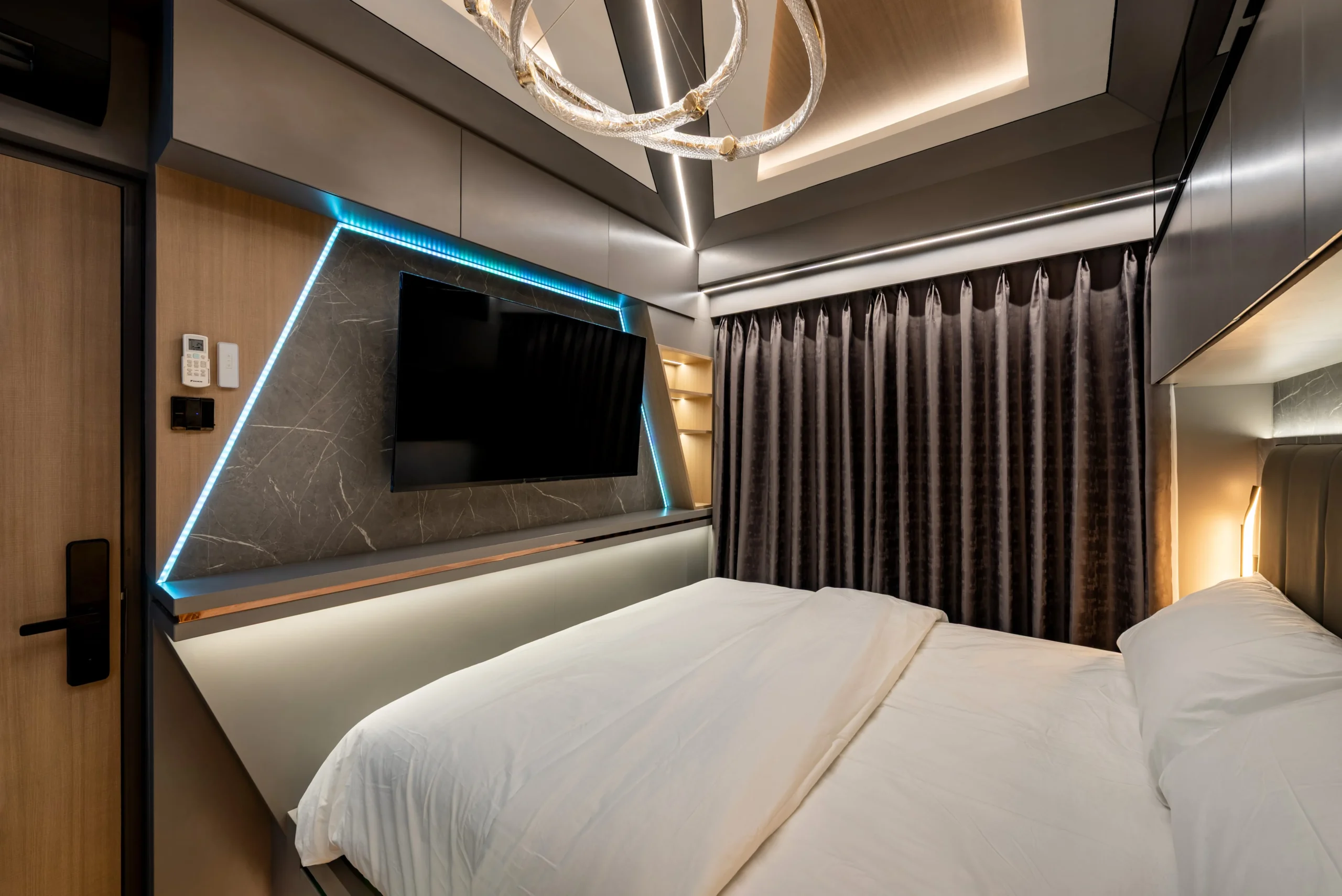 Tantangan utama pada proyek ini adalah bagaimana mengeksekusi bentuk-bentuk geometris yang rumit serta mengakomodasi kerumitan instalasi smart-technology tersembunyi, tanpa mengorbankan estetika dan proporsi ruang yang telah dirancang.