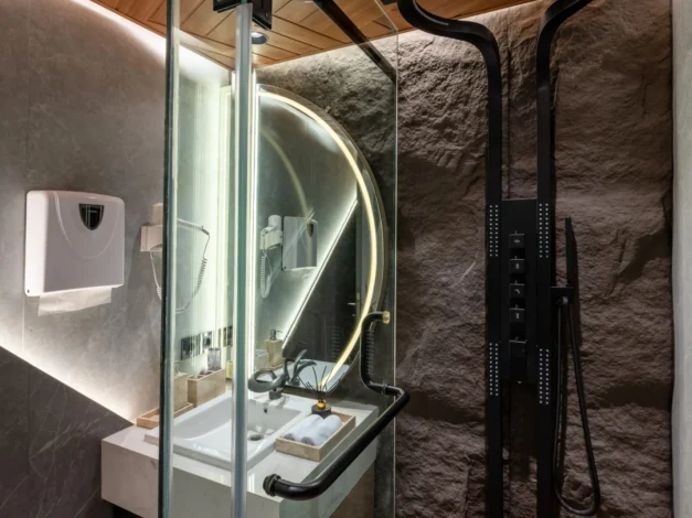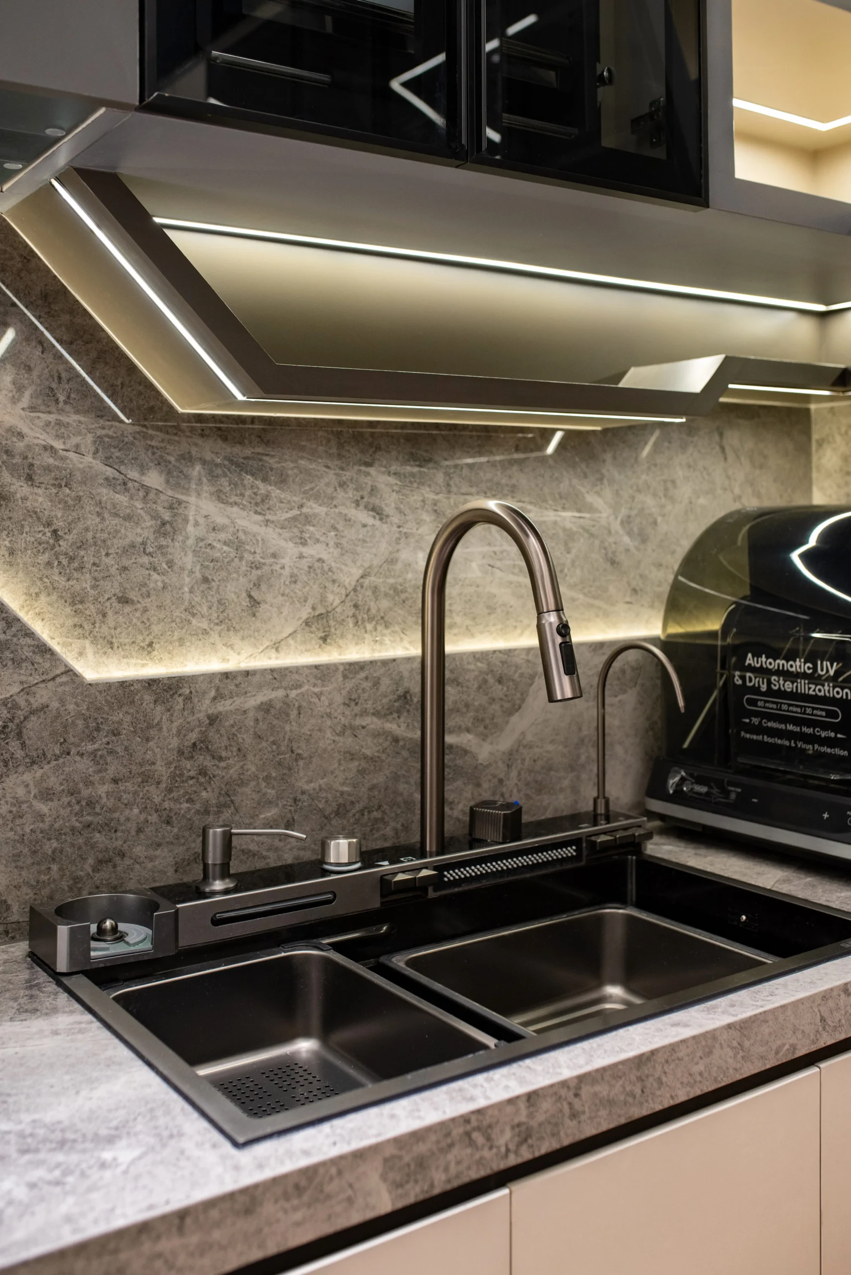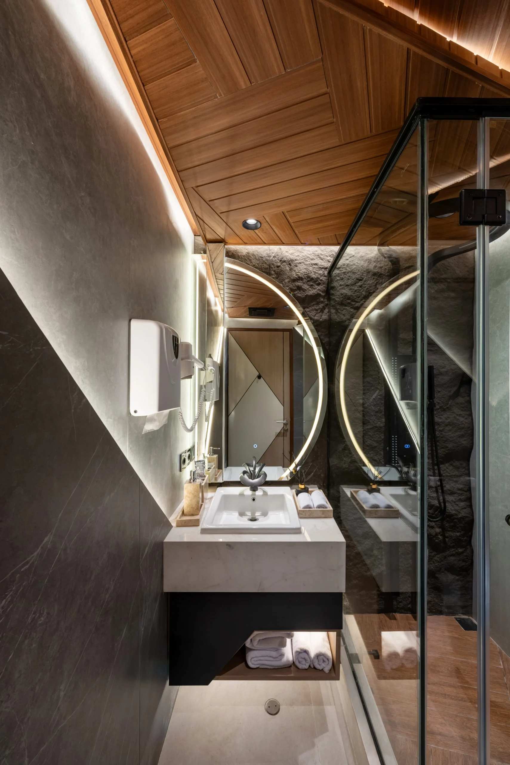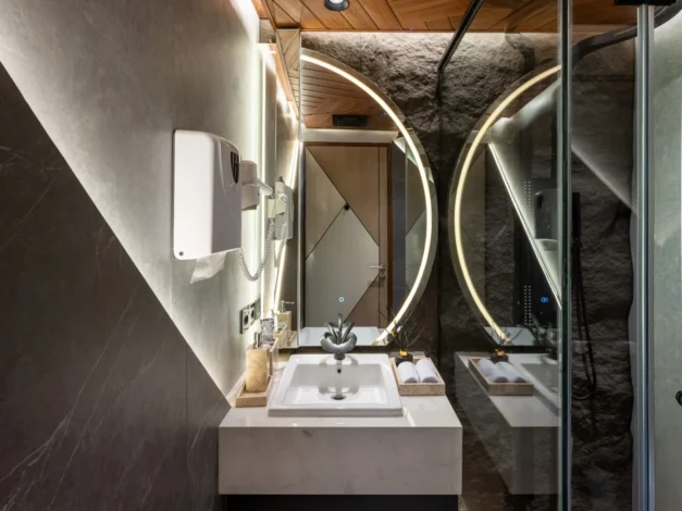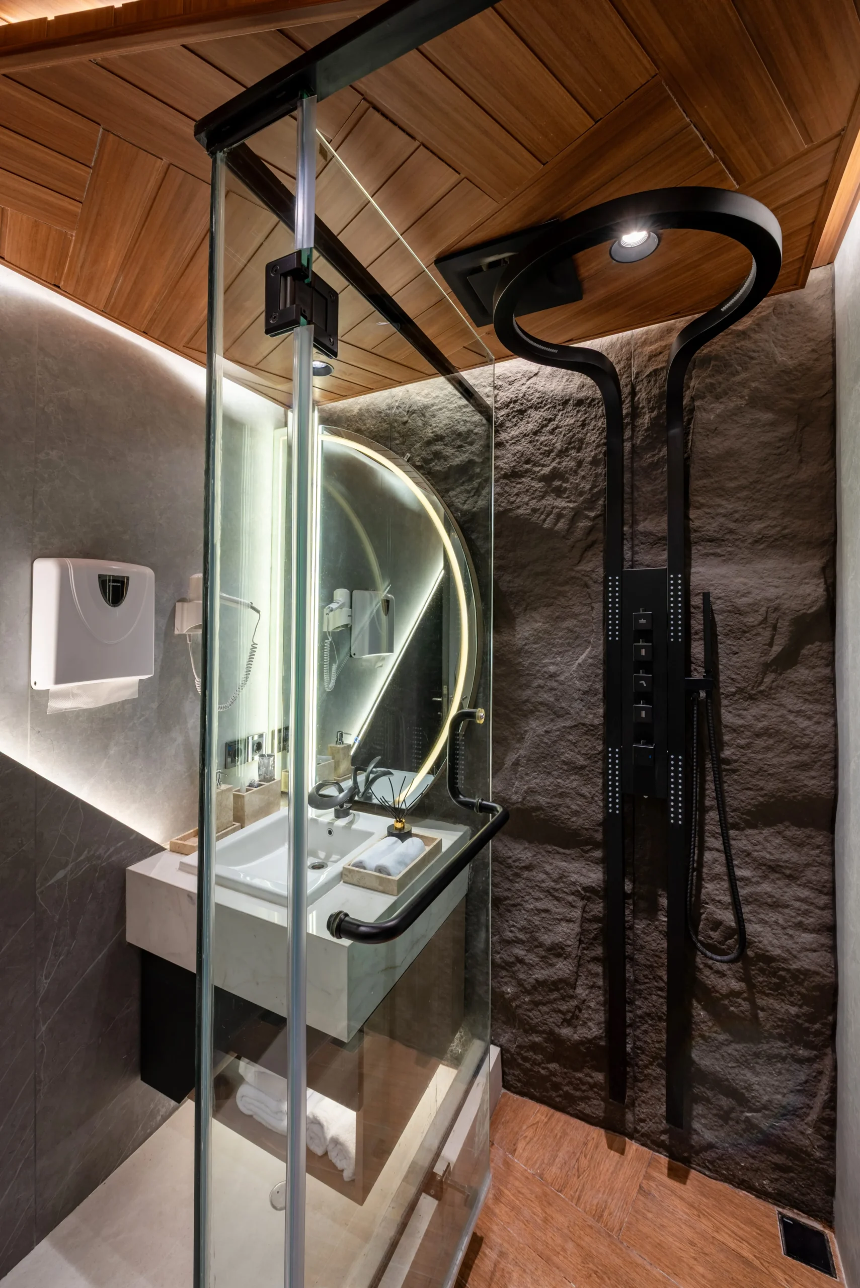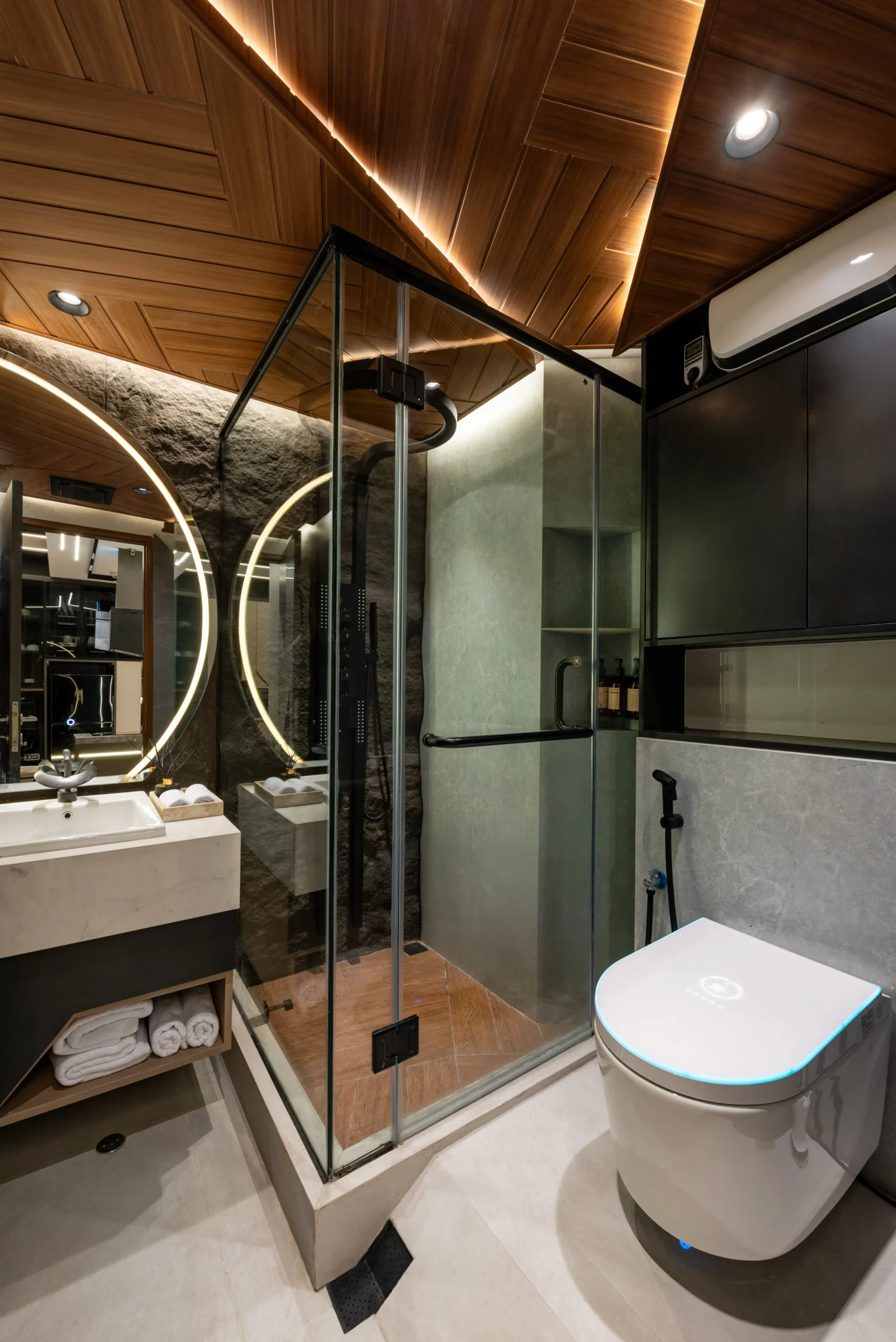Tantangan utama pada proyek ini adalah bagaimana mengeksekusi bentuk-bentuk geometris yang rumit serta mengakomodasi kerumitan instalasi smart-technology tersembunyi, tanpa mengorbankan estetika dan proporsi ruang yang telah dirancang.